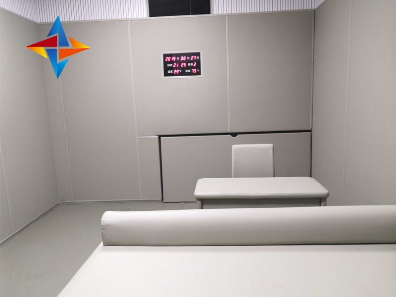 留置室軟包是一種留置室墻面加固穩定結構,輔材的設計為卡扣固定部件,常規規格為一米二與兩米四,厚度為一七毫米,二零毫米,二五毫米,三零毫米,顏色可選擇為淺灰和米黃,采用多層復合工藝,不使用復合膠壓制,該方法主要是通過包覆機器系統化在極大壓力與高溫下將預先制備好的納米棉基材側與阻燃皮革層層復合成型,再經特殊處理和適當干燥而獲得制品,該方法制造的談話室防撞軟包在實際測試中,留置室室內甲醛濃度小于0.05mg每平方米,而且無刺激性氣味產生。
