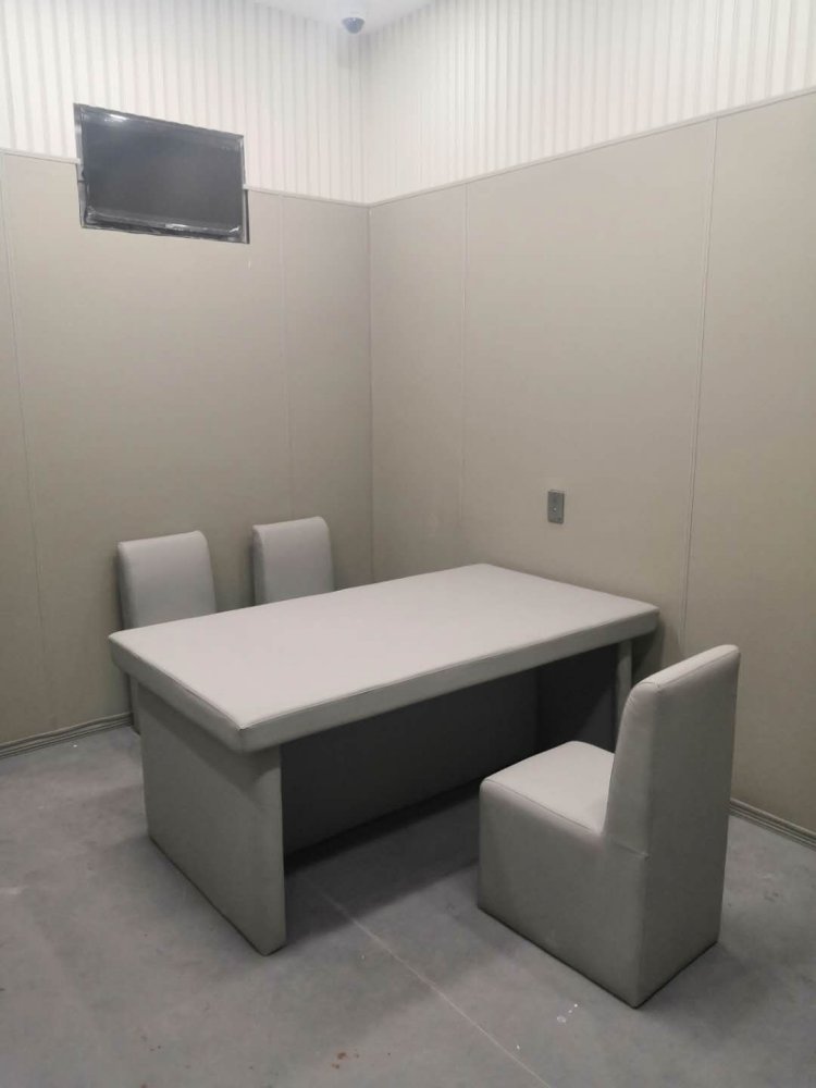 完善整墻:一般紀委審訊室等公檢法辦公室都是3米高的墻,墻剩余高度我們是建議在防撞墻面上安裝木質吸音板,不但可以吸音降低室內回音,還可以達到墻面裝飾美觀的效果,質量好實用性強而且經濟實惠。還適用于紀委審訊室、監察室、公檢法、公安局、派出所、詢問室、檢察院、法院等場所。